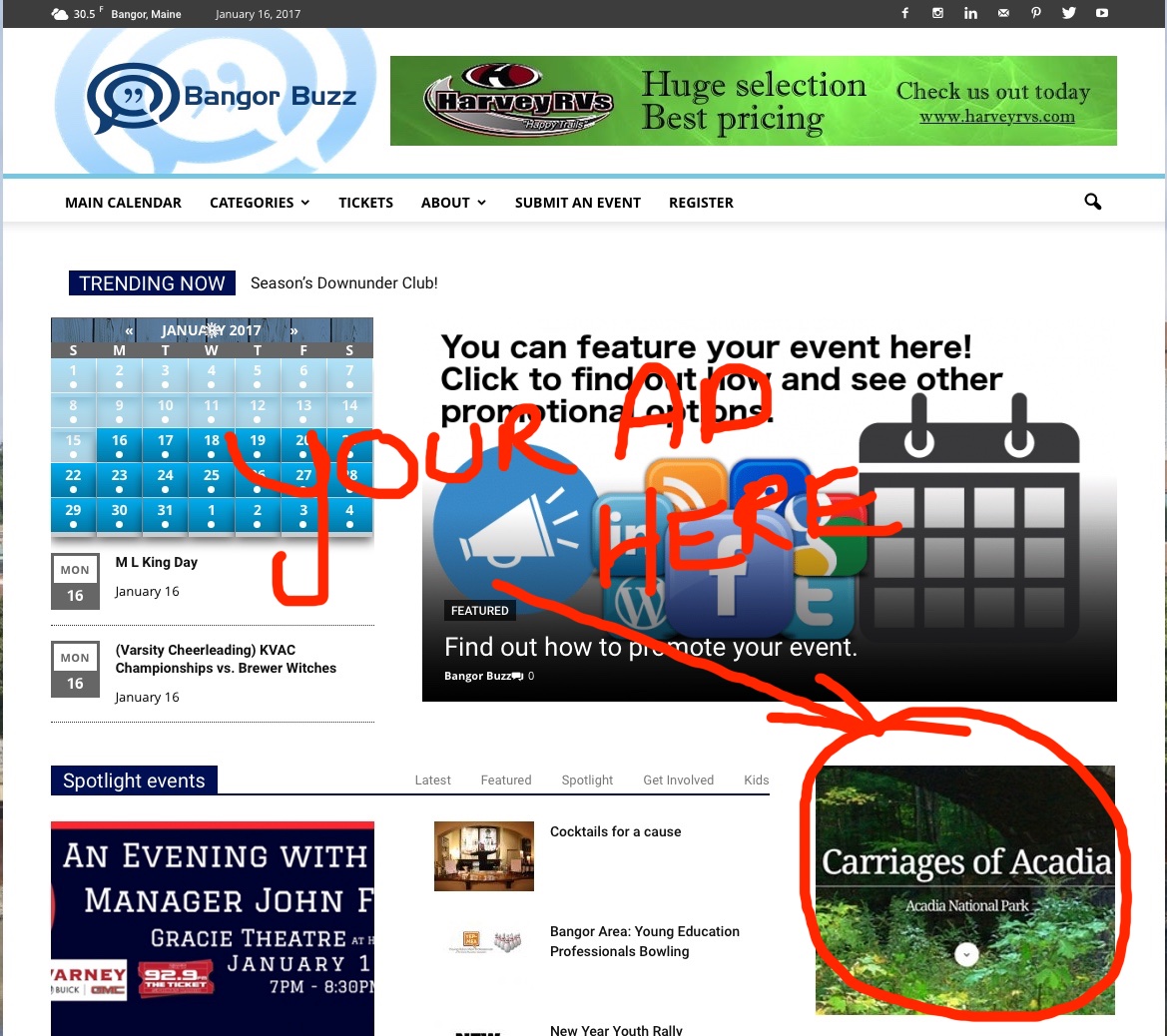 In celebration of our appearance at the upcoming event, Bangor on Tap, we are running a special. Have your ad, for your business or event(s), appear on our website sidebar and mobile site for $25.00 per month. That is 50% off the regular price. All you have to do is contact us and we will get you started today.